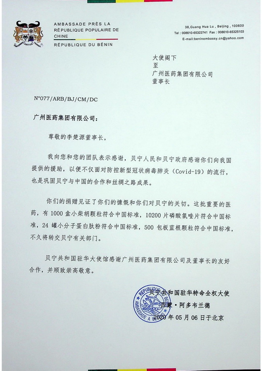 ¿ËÈÕ£¬¹ãÒ©¼¯ÍÅÊÕµ½ÁËÀ´×Ô±´Äþ¹²ºÍ¹úפ»ª´óʹ¹Ý¼°´óʹ¶Ô¹ãÒ©¼¯Íż°¹ãÒ©¼¯ÍŶʳ¤Àî³þÔ´µÄллÐÅ£¬¶Ô¹ãÒ©¼¯ÍŰ®ÐÄÔ®ÍòÀÓë±´Äþ¹²ºÍ¹ú¹²µ£·çÓê¡¢¹²¿Ëʱ¼è£¬Ð¯ÊÖ¿¹ÒßËù×öµÄÆð¾¢ÌåÏÖлл¡£